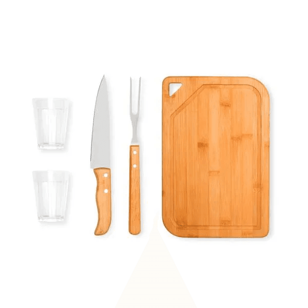 Kit para Churrasco. Composto por tábua em Bambu; dois copos americanos em vidro; faca 7" e garfo em Madeira/Inox Como cortesia, na faca 7" fazemos uma gravação com os cortes do boi.