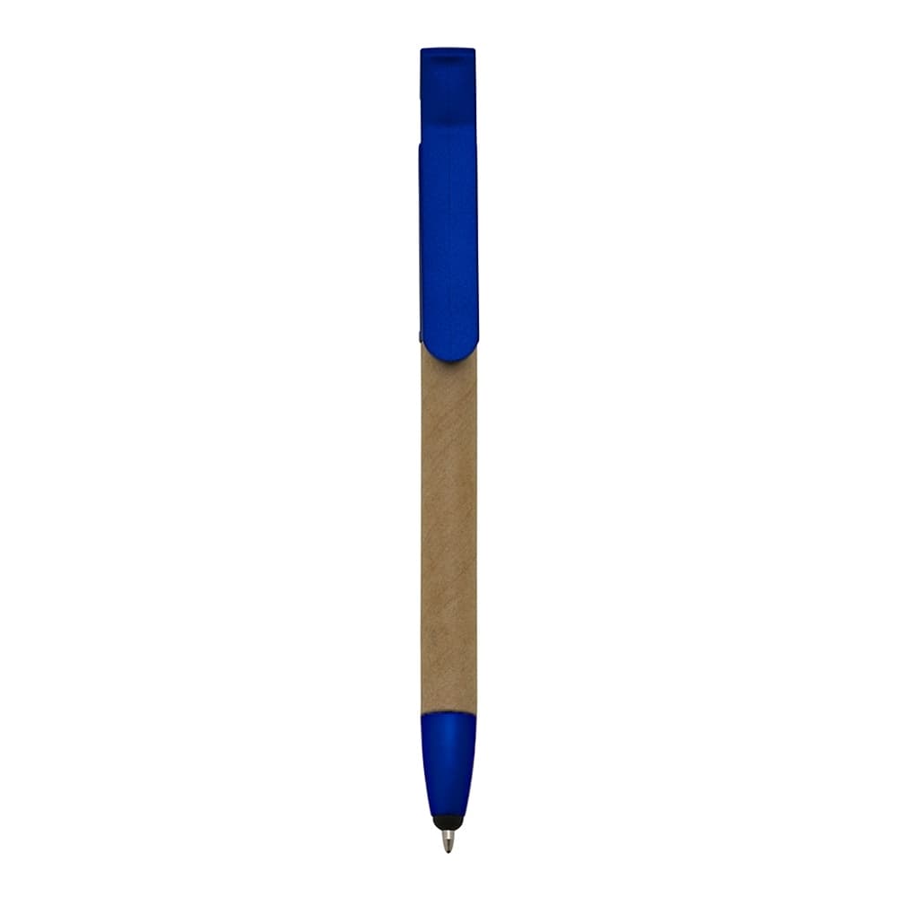 Caneta de papelão com detalhes plásticos, contém suporte para celular, ponteira touch screen e limpador de tela. Carga esferográfica azul 1.0 mm e acionamento por rotação.