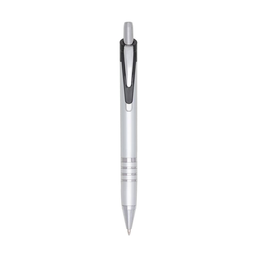 Caneta plástica com carga esferográfica azul 1.0 mm e acionamento por clique.