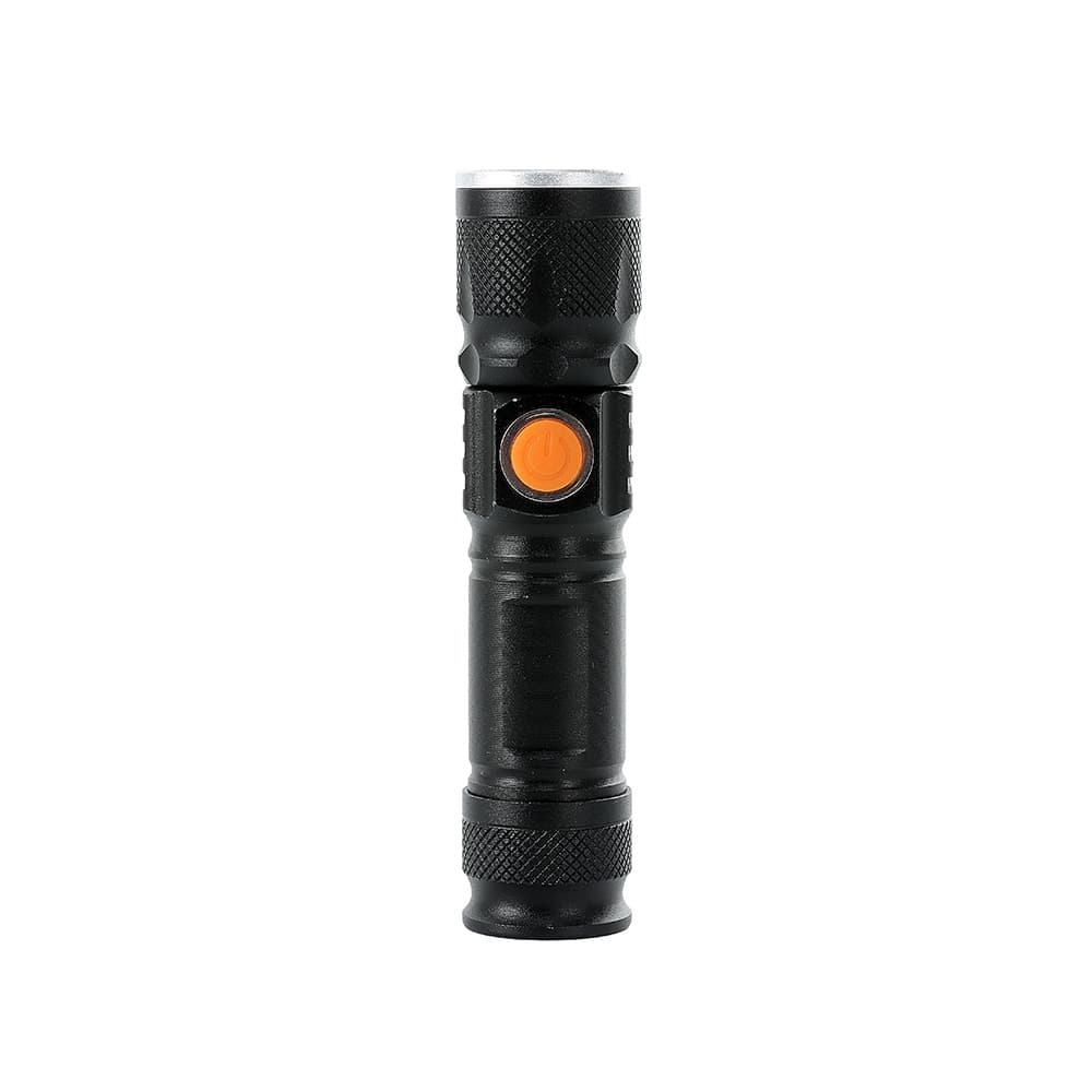 Lanterna led recarregável com zoom de regulagem e três estágios de iluminação, material metálico com USB acoplado para carregamento. Acompanha cordão de nylon.