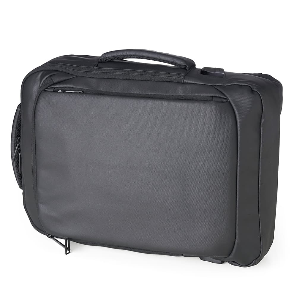 Mochila em couro sintético 17 litros resistente à água com cinco compartimentos, sendo o principal com bolso para notebook 156. Com divisórias internas para acessórios, a mochila possui suporte externo usb, alça para encaixe em malas de viagem e duas alças de mãos, sendo uma delas lateral para o transporte da mochila no modo pasta.