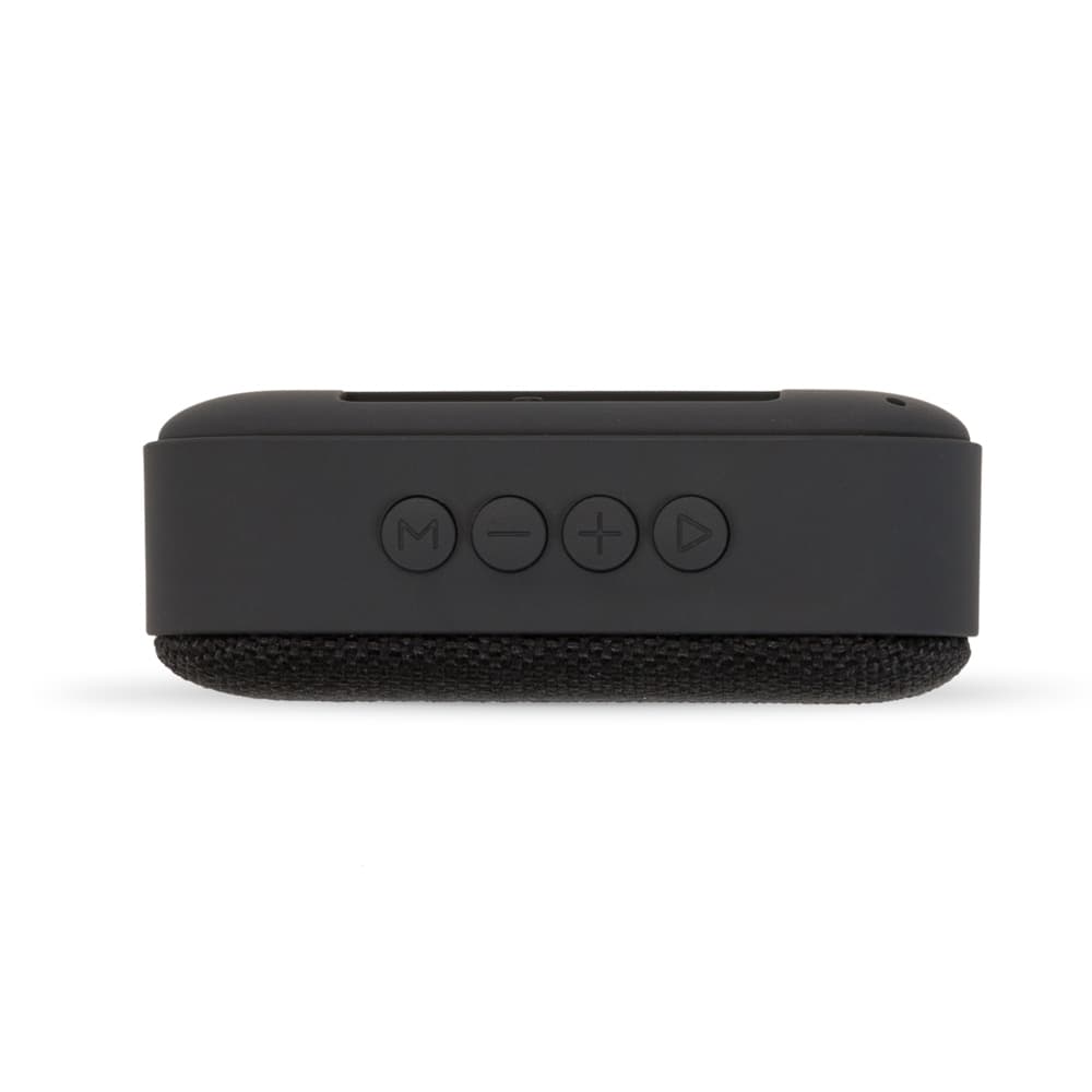 Caixa de Som Multimídia. Produzida em material emborrachado, tela de proteção do auto-falante em tecido, parte inferior com borrachas anti-deslizantes. Possui os botões de Play/Pause; Aumentar e diminuir volume/avançar e retroceder faixas; Modo; Entrada USB; Entrada TF (cartão MicroSD); Botão On/Off e Entrada DC 5V. Acompanha cabo USB.