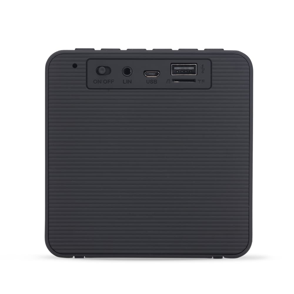 Caixa de Som Multimídia com relógio digital. Material emborrachado com display superior frontal, tela de proteção dos falantes em tecido, parte inferior com borrachas anti-deslizantes. Possui botões de Relógio/Alarme; Telefone/Atender chamadas; Mode; - retroceder/diminuir; + avançar/aumentar; Play/Pause/Troca; Microfone; Botão on/off; Entrada auxiliar P2; Entrada DC 5V; Entrada USB e Entrada TF (cartão MicroSD). Acompanha cabo USB e manual de instruções em chinês/inglês.