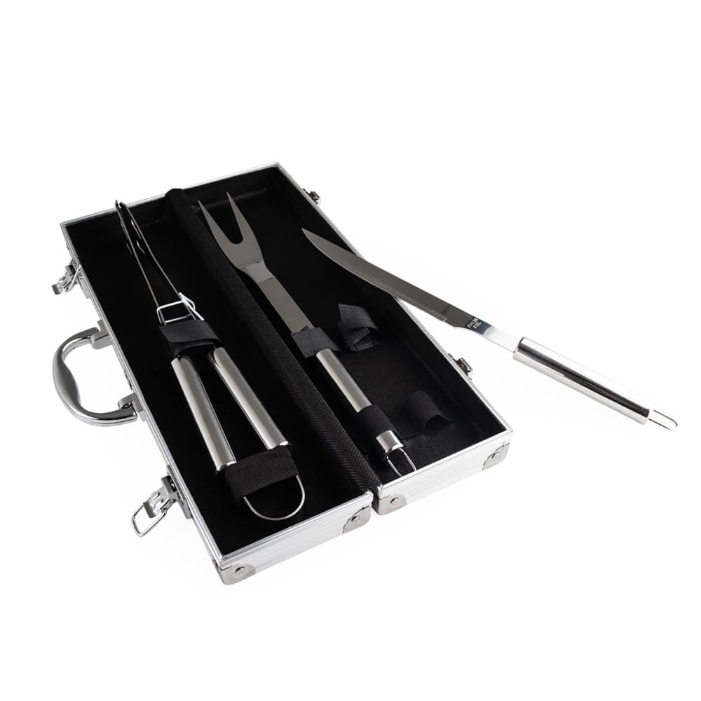 Prepare churrascos deliciosos com nosso kit de três peças, ideal para quem busca qualidade e precisão no preparo de carnes e outros alimentos. O conjunto inclui uma pinça, um garfo e uma faca de sete polegadas, acompanhados de uma elegante maleta de alumínio com plaquinha para personalização, garantindo mais exclusividade e organização.