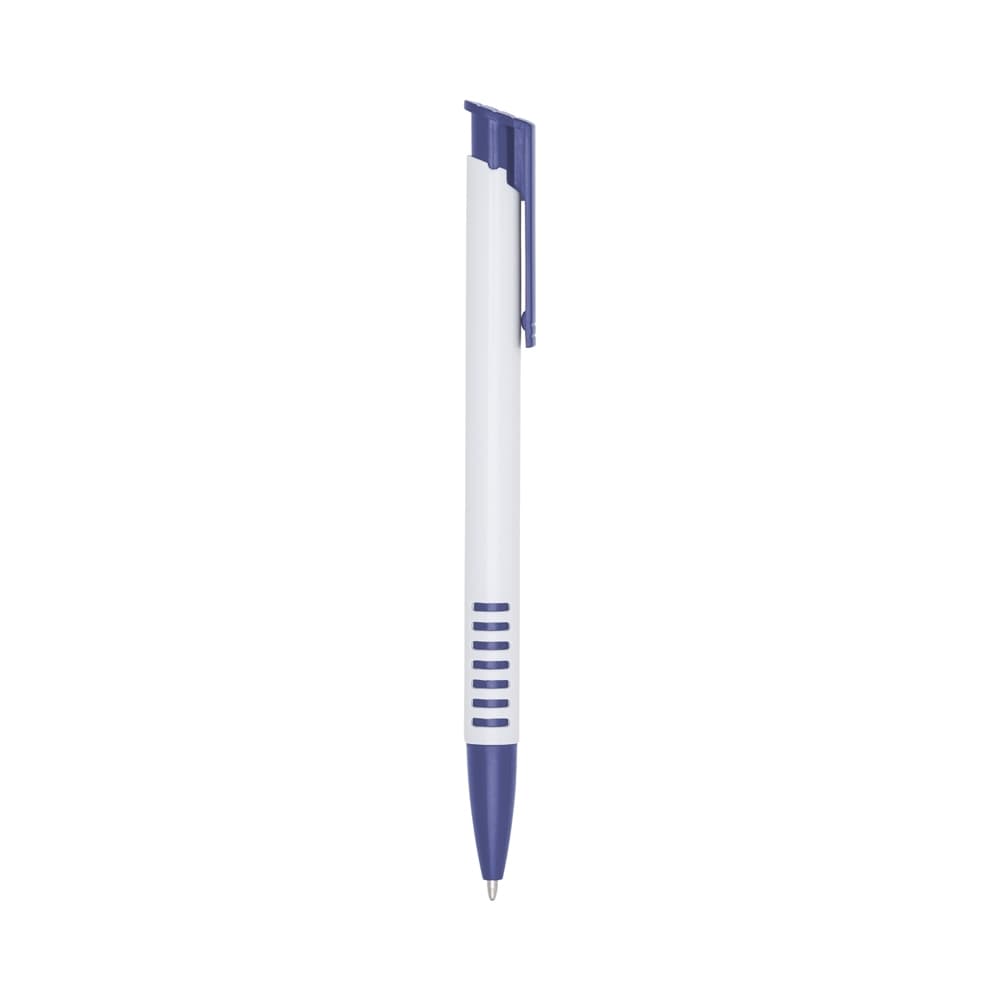 Caneta plástica com carga esferográfica azul 1.0 mm e acionamento por clique.