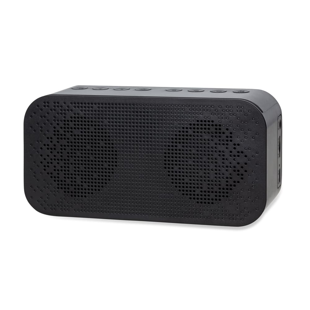 Caixa de som multimídia com relógio despertador e suporte para celular. Produzida em plástico e com borrachas antiderrapantes na área inferior, a caixa de som tem a área frontal espelhada e display de LED, além de um compartimento com suporte para celular – uma espécie de “gaveta” aonde é exibido (CLOCK SPEAKER), basta puxá-la ter acesso ao compartimento. A caixa de som executa nos modos bluetooth, rádio FM, cartão TF-microSD (até 16GB) e entrada auxiliar P2. Acompanha cabo USB e manual em inglês.