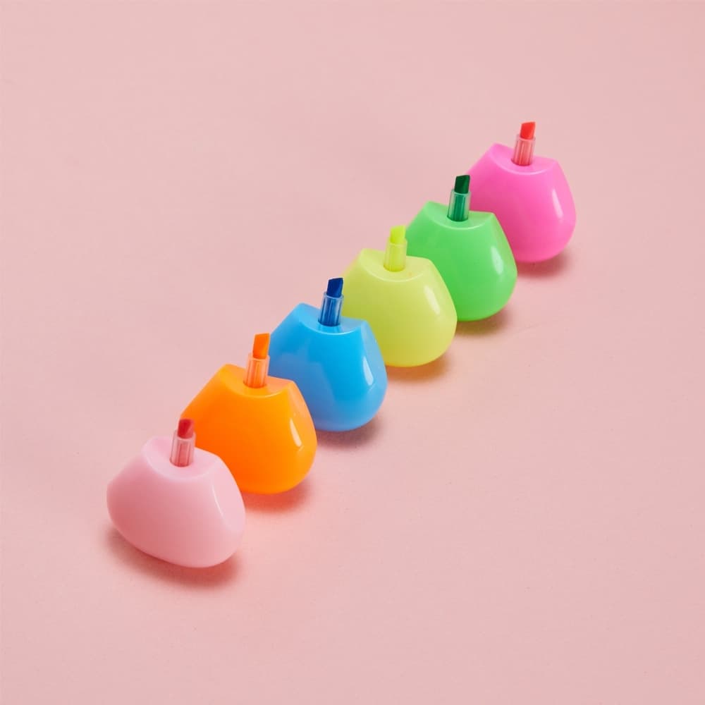 Caneta marca texto em formato Flor na cor branca de frente e verso liso, possui as cores: azul, verde, rosa, amarelo, laranja e rosa escuro.