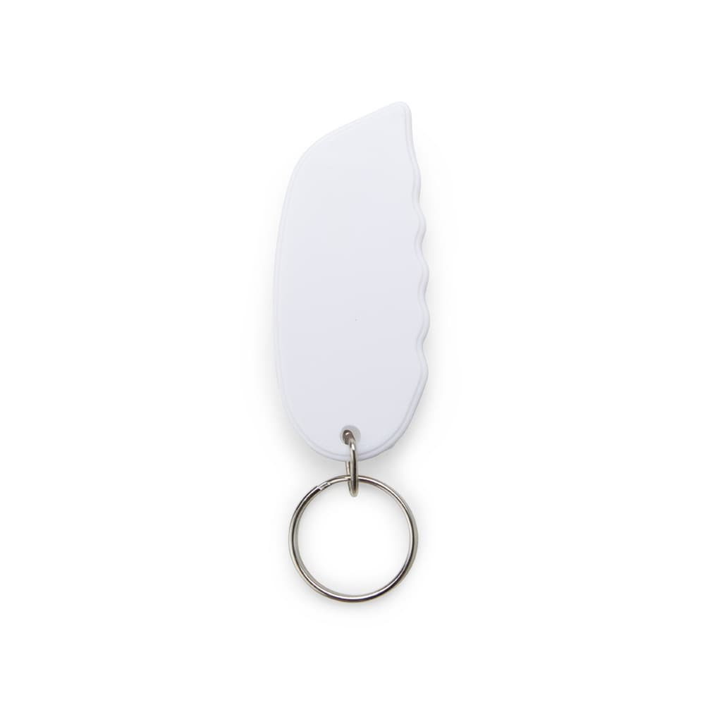 Chaveiro estilete projetado em plástico com sistema de retração automática para maior segurança. Após o uso, basta soltar o botão e a lâmina retorna automaticamente à posição de armazenamento, minimizando o risco de acidentes.