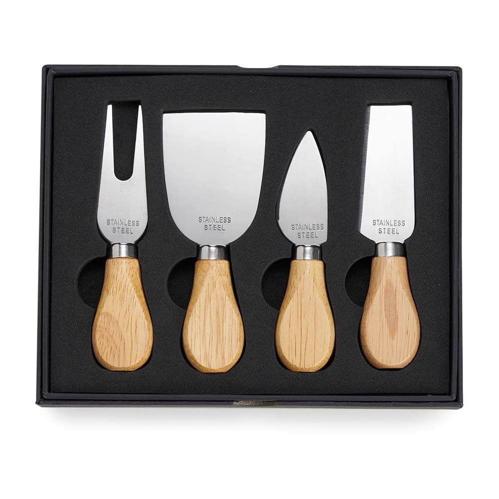 Kit queijo 4 peças em estojo de papelão com berço de espuma, contém: faca com ponta, faca reta, garfo e espátula