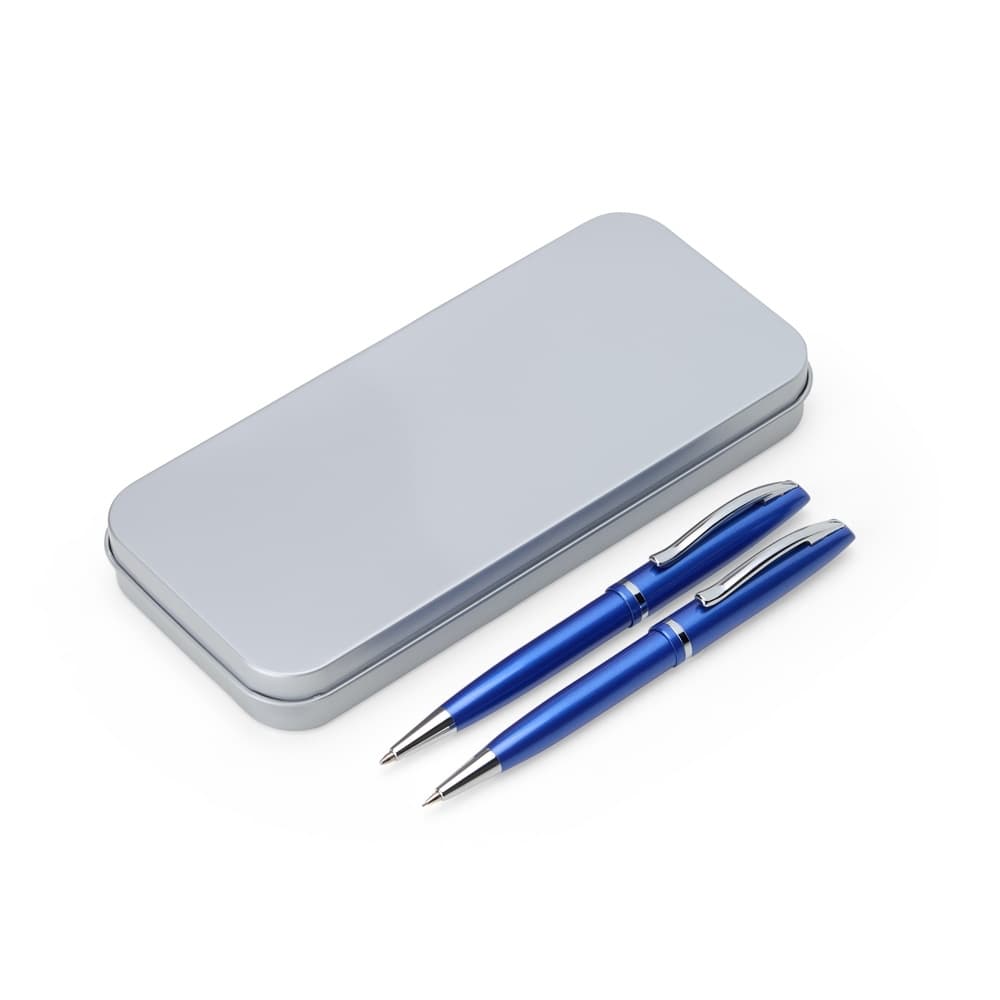 Conjunto de caneta e lapiseira metálicas em estojo metal. Caneta e lapiseira possuem acabamento brilhante, carga esferográfica azul de 1.0mm e acionamento por rotação.