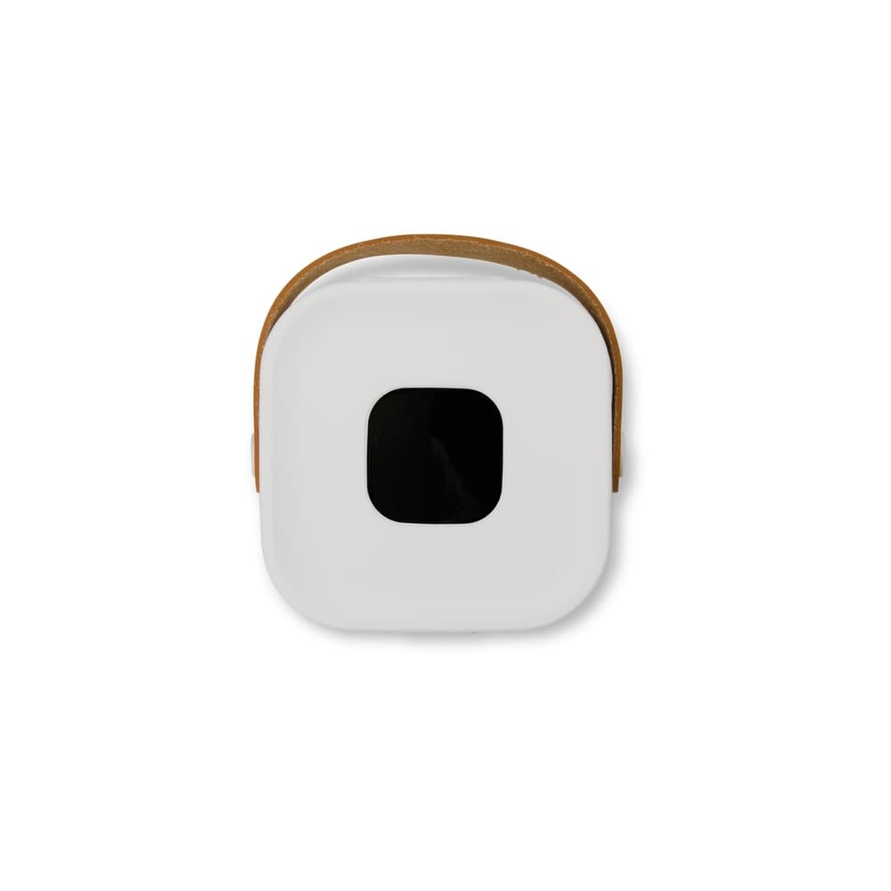 Porta-joias com espelho, produzido em plástico com alça de couro sintético e berço de silicone removível.