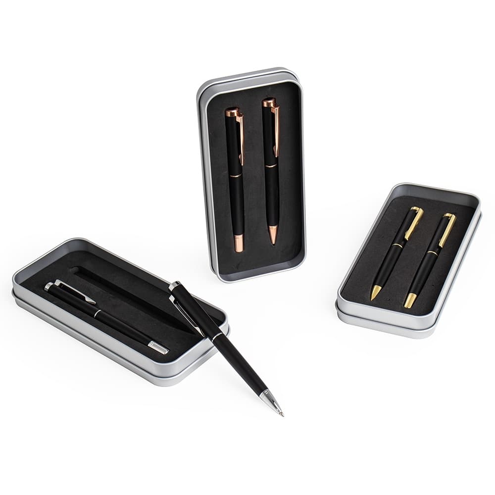 Descubra nosso sofisticado kit de canetas esfero e roller em metal, perfeito para quem valoriza estilo e funcionalidade. Com acabamento fosco, a caneta esferográfica possui acionamento por rotação e carga azul de 1.0mm, garantindo uma escrita suave e precisa. A caneta roller com carga de 0.7mm, oferece um traço delicado e fluido. Acompanha um estojo de metal revestido em espuma, que protege e exibe suas canetas com elegância.