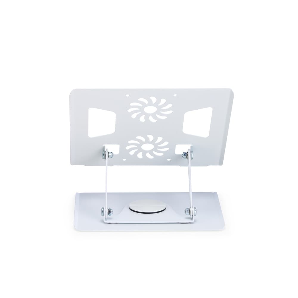 Suporte articulado para notebooks com ajuste em diversos ângulos, com a possibilidade de realizar movimentos giratórios em até graus, tudo isso para alcançar a melhor posição de uso do aparelho com mais conforto e ergonomia nos mais variados ambientes, como escola, trabalho ou em casa. A construção funcional em aço do suporte e suas aberturas nas laterais e no centro ajudam na dissipação de calor do aparelho aliada com as tiras antiderrapantes nas laterais e nas bordas inferiores garantem um uso mais seguro e estável do eletrônico.