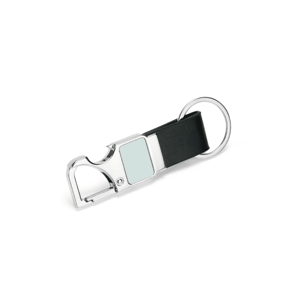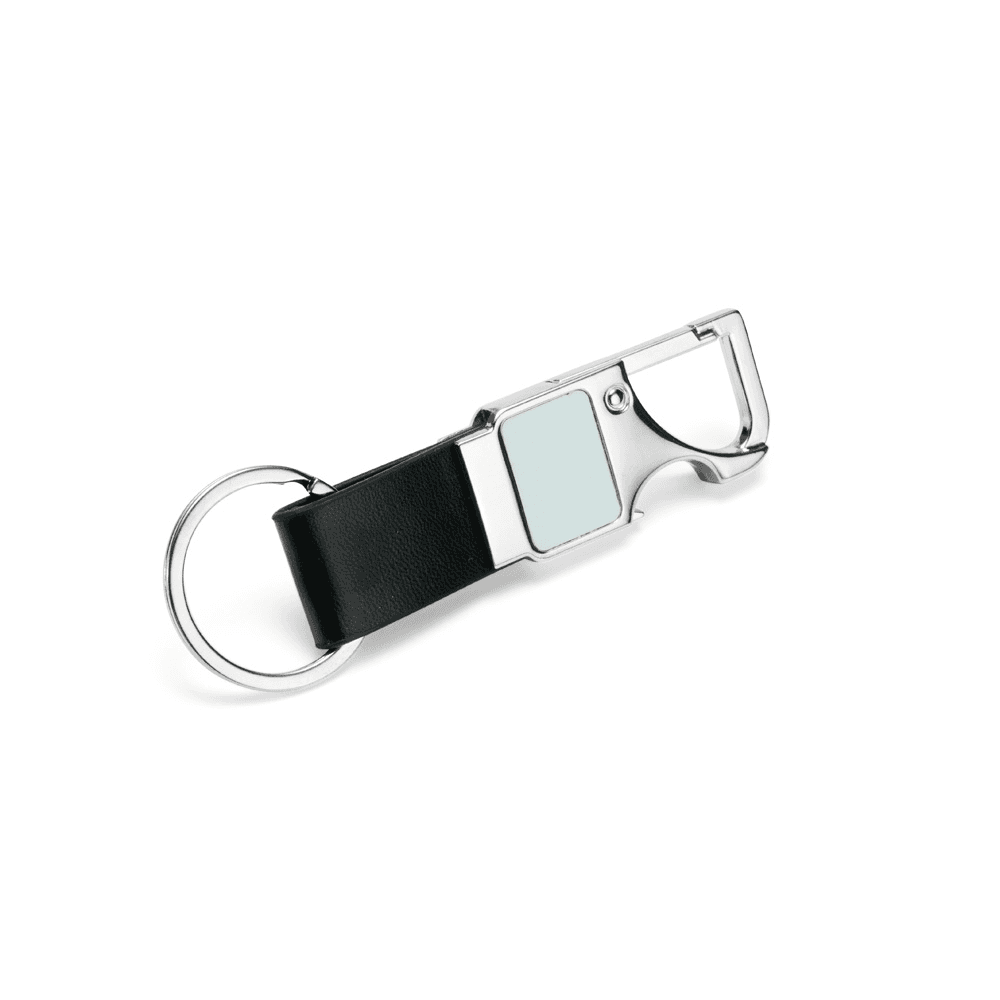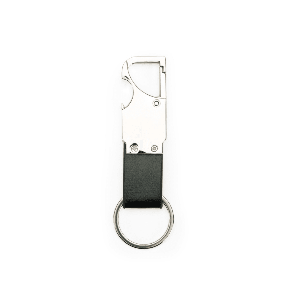 Chaveiro em metal com tira em couro sintético. Possui mosquetão e pode ser utilizado como um abridor de garrafas.