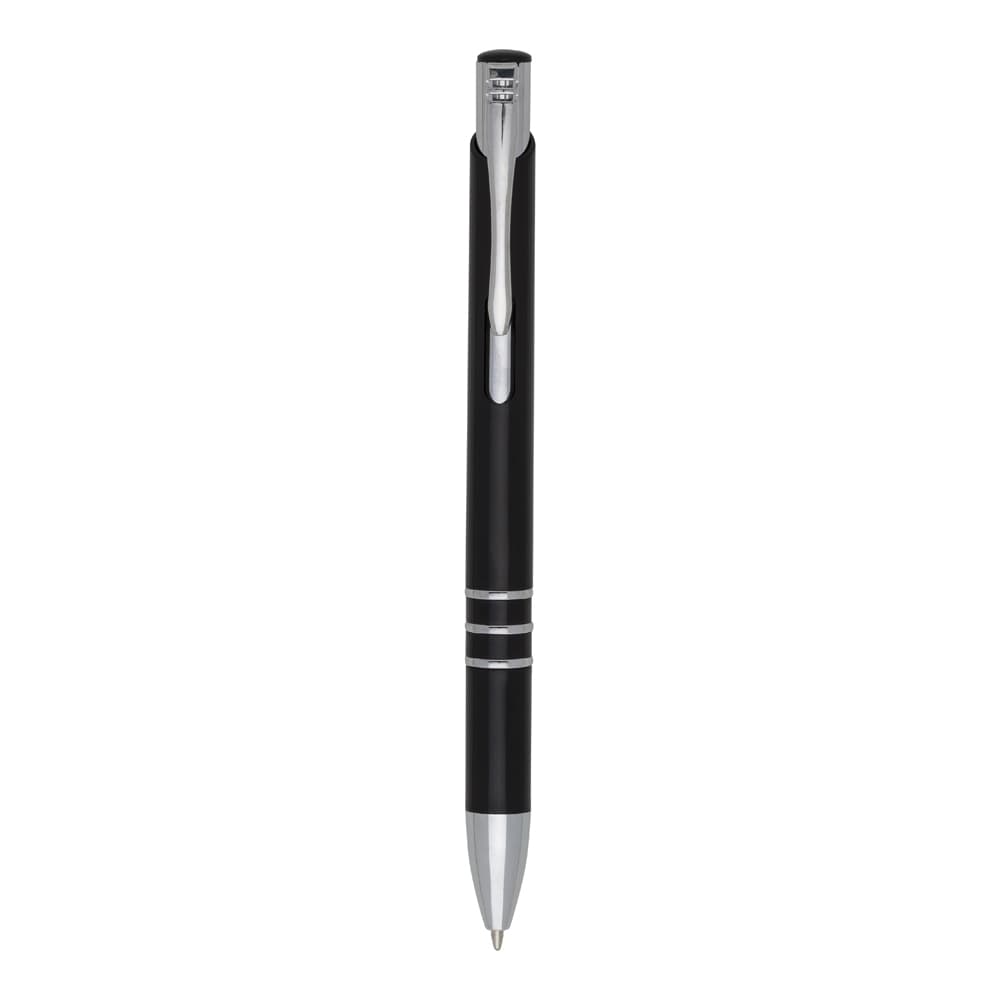 Caneta plástica com carga esferográfica azul 1.0 mm e acionamento por clique.