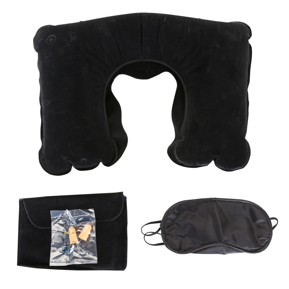 Kit viagem com 3 peças, contém: travesseiro inflável(revestido de veludo), máscara para olhos de cetim(revestido com espuma) e um par de protetor auricular. Acompanha uma nécessaire de veludo para guardar o kit.