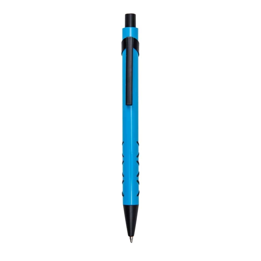 Caneta metálica com detalhe emborrachado, carga esferográfica azul e acionamento por clique.