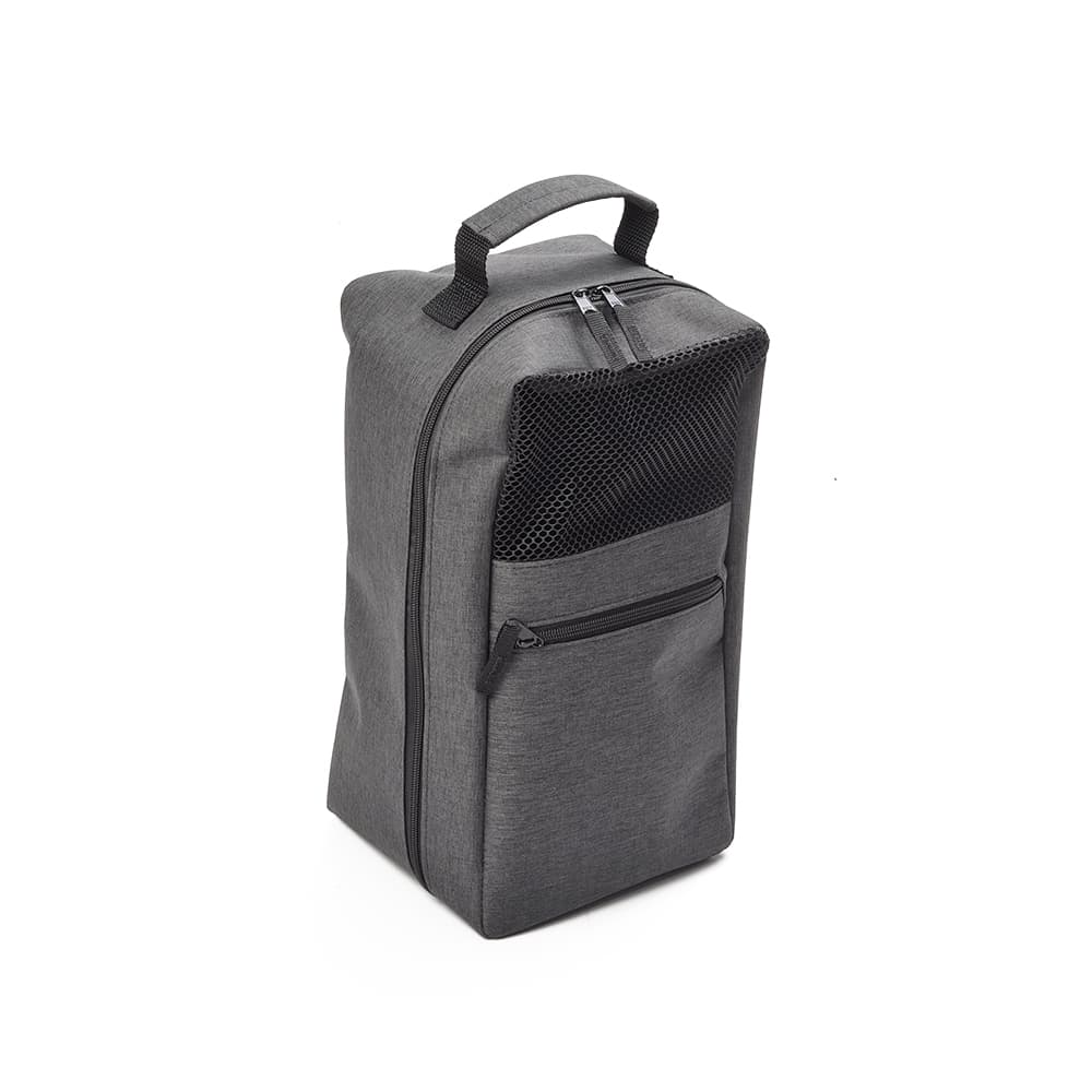Porta tênis em poliéster. Possui bolso frontal com zíper, detalhe telado na parte frontal e alça de mão em nylon.