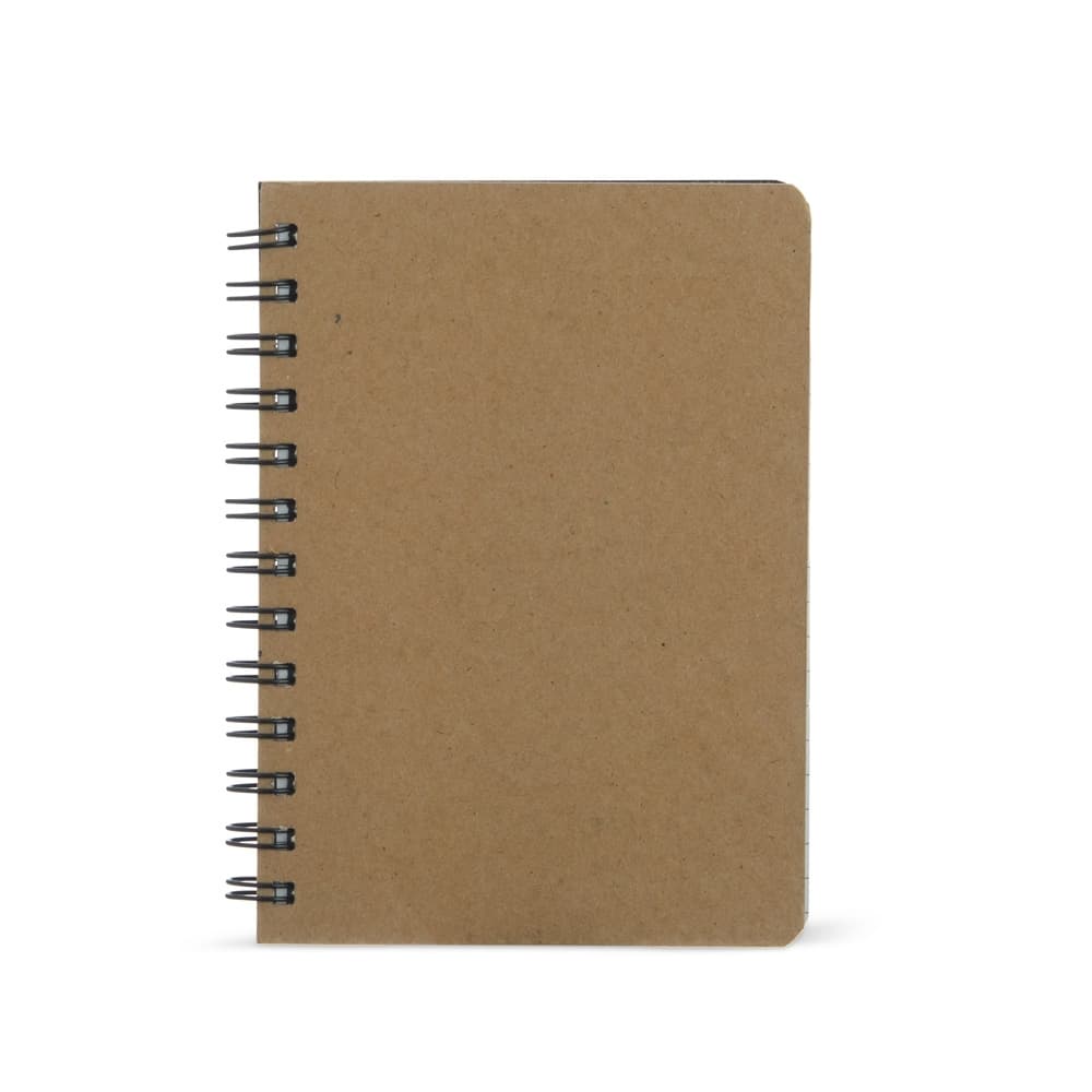 Caderno capa dura em kraft com wire-o. Contém aproximadamente 80 folhas brancas pautadas.