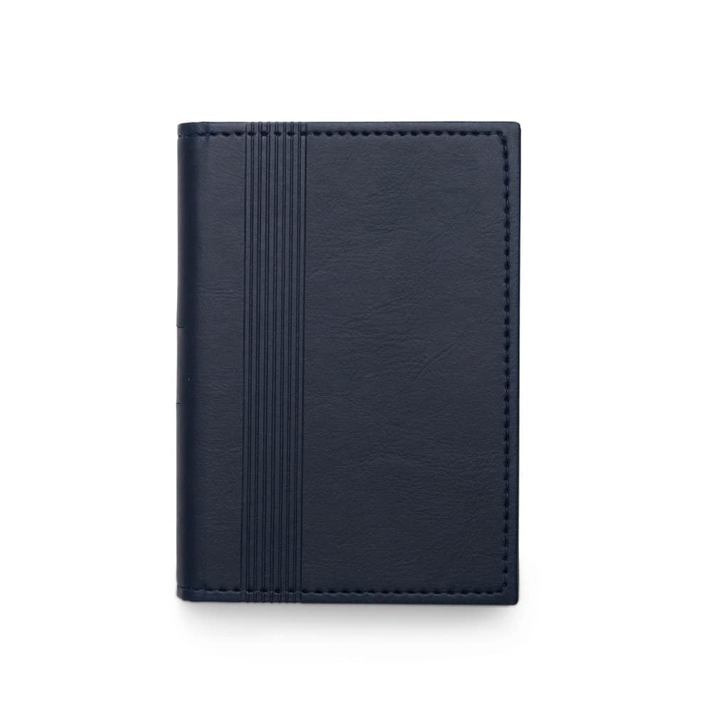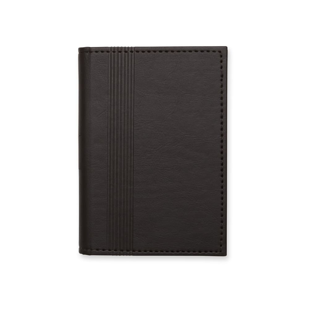 Caderneta em couro sintético com porta caneta e compartimento para arquivar folhas. Possui aproximadamente 80 folhas marfim sem pauta.