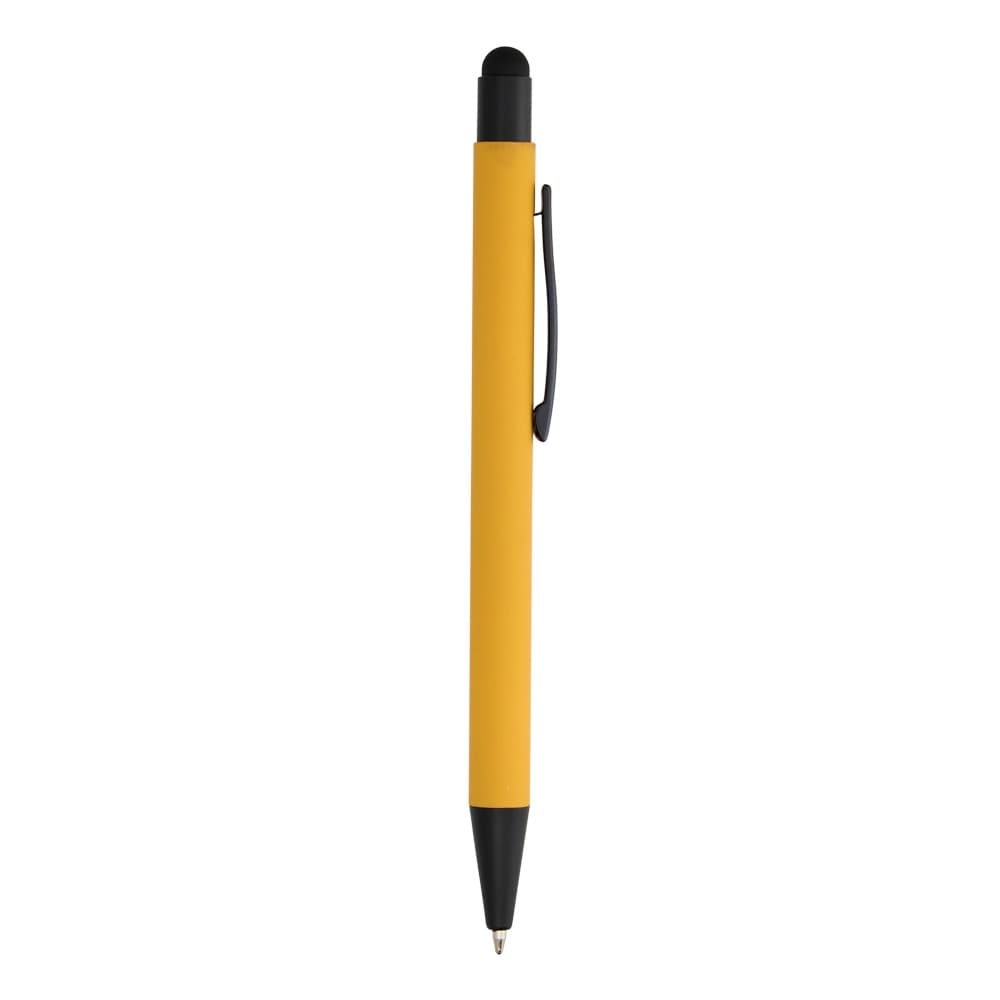 Caneta metálica touchscreen com acabamento emborrachado, acionamento por clique e carga esferográfica azul 1.0mm.