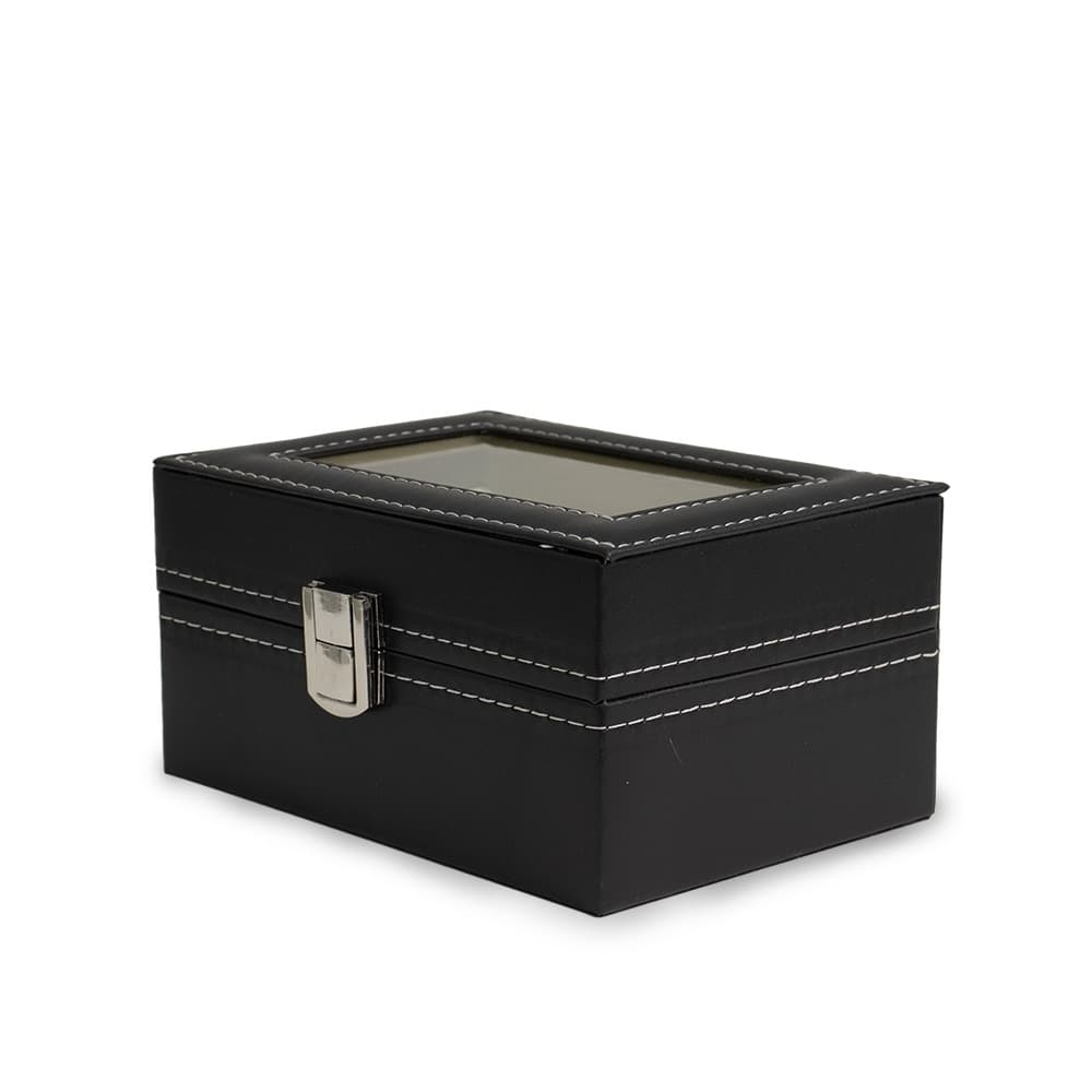 Porta relógios em couro sintético com revestimento aveludado. Possui três divisórias com almofadas para relógios, visor em acrílico e fechadura com trava.