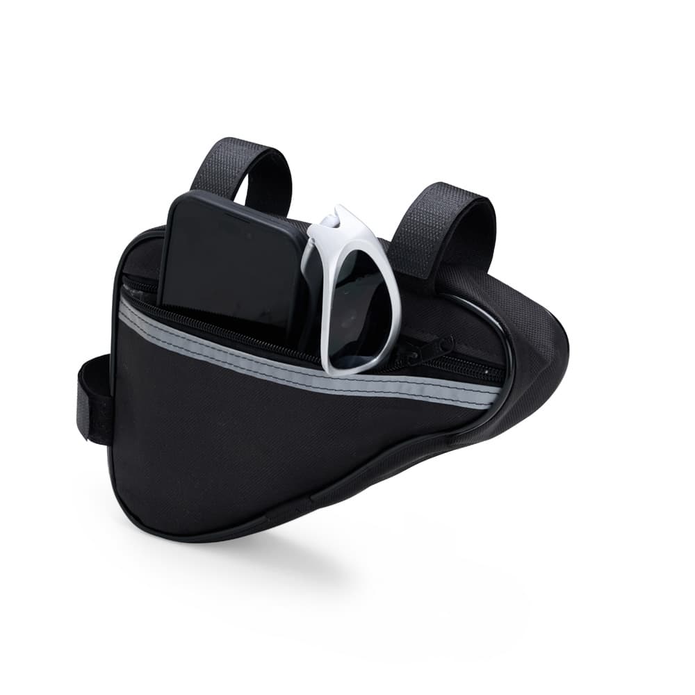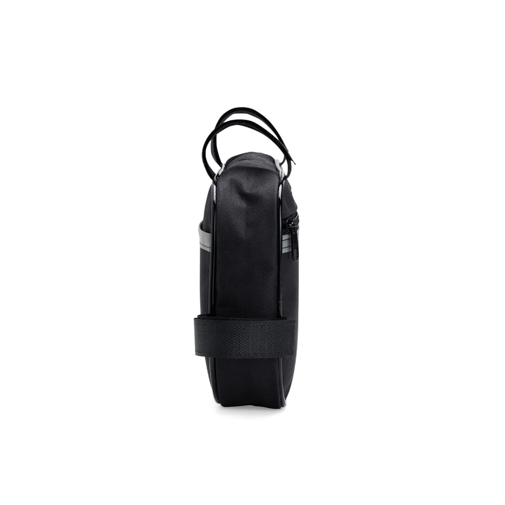 Esta bolsa para quadro é uma opção prática para carregar objetos enquanto estiver andando de bicicleta. Confeccionada em Oxford resistente e impermeável, a bolsa conta com único compartimento com fechamento em zíper, o que a torna ideal para armazenar objetos menores de forma eficiente, protegendo todo o conteúdo de seu interior contra a chuva e respingos dágua durante o trajeto. Conta com uma tira refletiva costurada para maior visibilidade no trânsito, além de alças de nylon com fechamento em velcro de fácil ajuste para o encaixe correto no quadro da bicicleta.