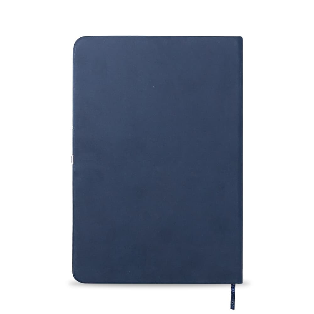 Caderneta emborrachada com fecho metálico imantado. Possui aproximadamente 96 folhas amarelas pautadas e marca página de cetim.