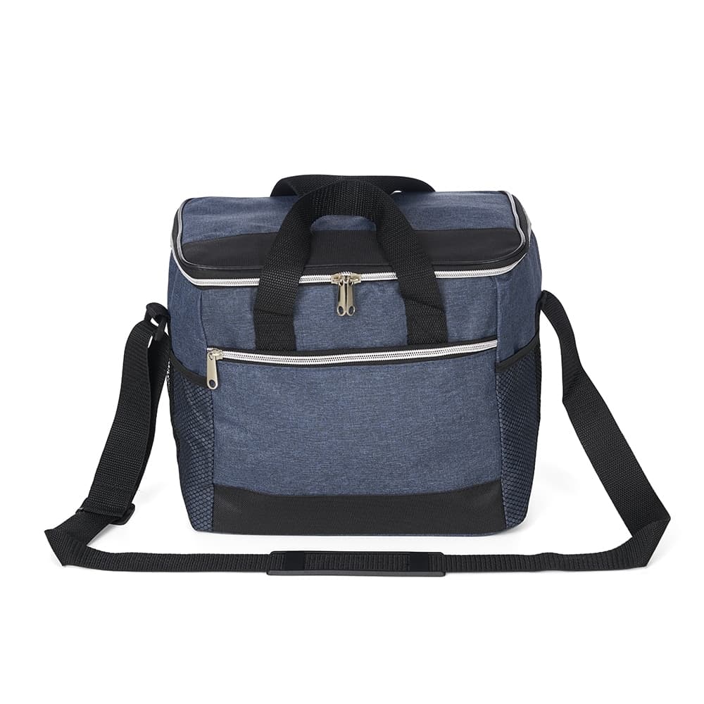 Bolsa térmica de poliéster 18 litros. Contém bolso frontal com zíper, bolsos laterais telados, alça de mão em nylon e alça transversal regulável (não removível) com apoio para ombro.
