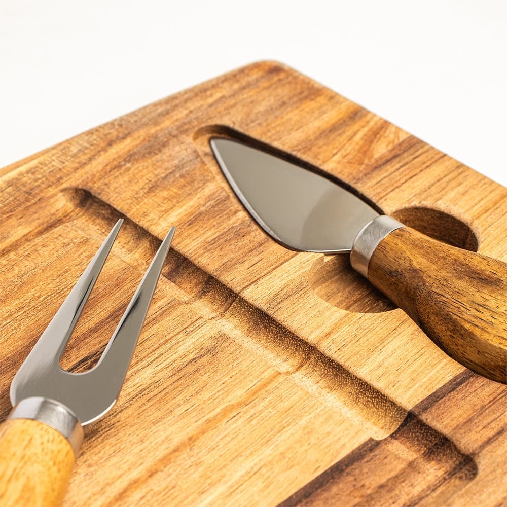 54293 HAVEN. Tábua de queijos em madeira de acácia com 2 utensílios em madeira de acácia e aço inox