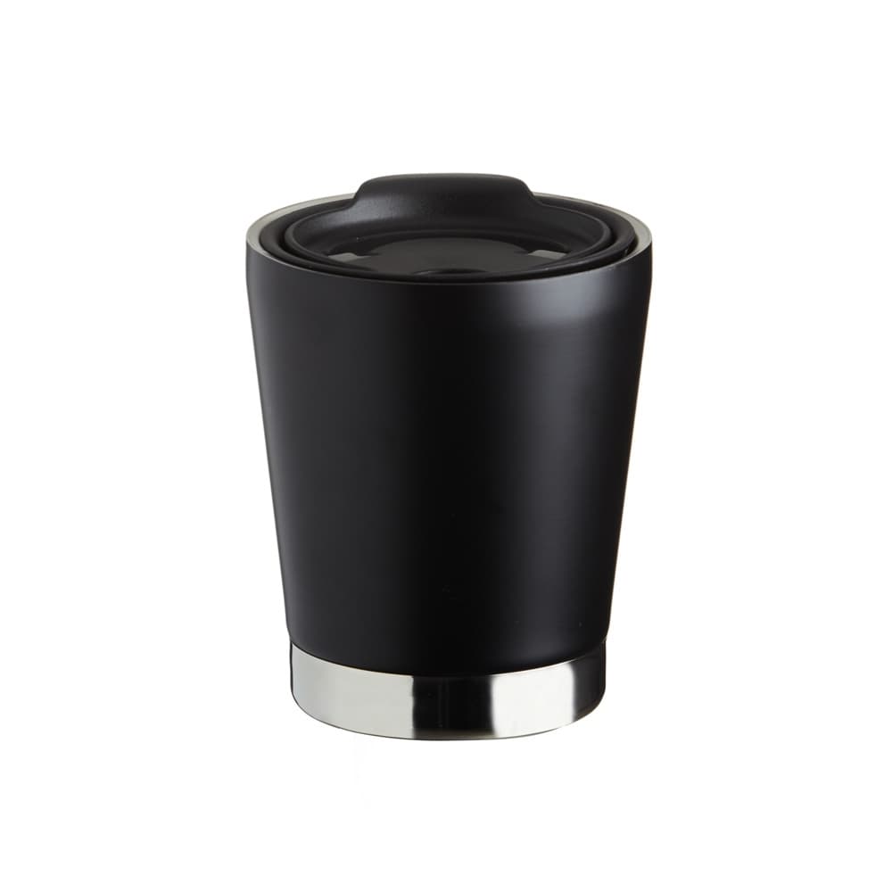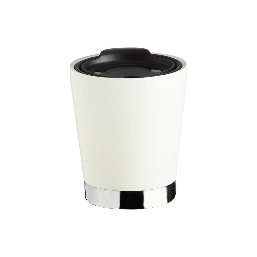 Copo de parede dupla em inox 304 com capacidade de 300ml, possui tampa plástica de encaixe com acesso ao bocal e área para canudo (não acompanha).