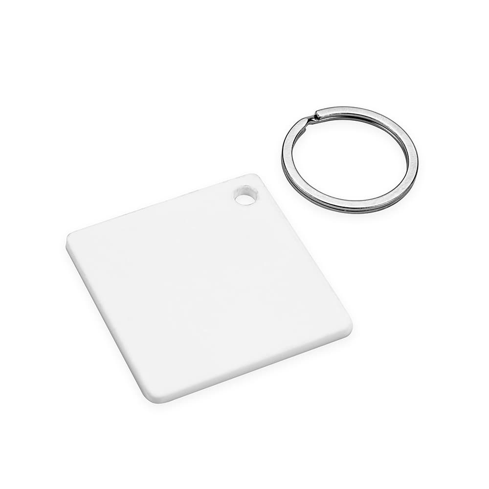 Chaveiro de acrílico em formato quadrado, frente, verso liso. Possui prendedor de plástico que conecta a argola metálica.