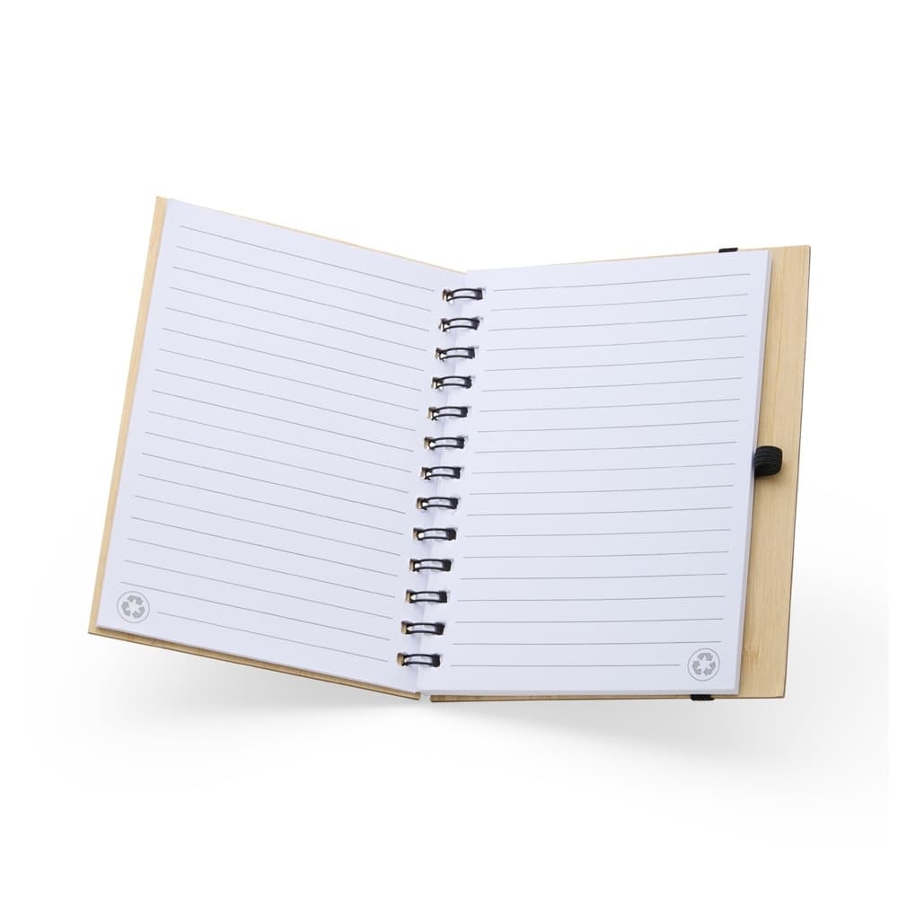 Caderno ecológica com caneta. Capa de papelão com folha similar ao bambu. Possui aproximadamente 70 folhas brancas pautadas com logo reciclado na lateral inferior. Acompanha suporte elástico de nylon com uma caneta de papelão de detalhes plásticos.