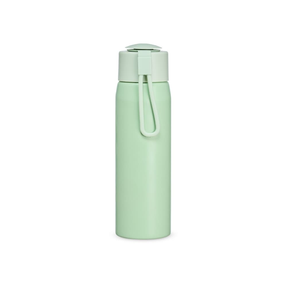 Garrafa alumínio 600ml com acabamento fosco. Possui tampa rosqueável com alça para transporte.