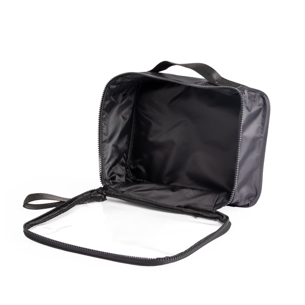 Nécessaire confeccionada em nylon, com frente em visor transparente, fechamento por zíper e alça superior. Inclui também uma alça de transporte em nylon.