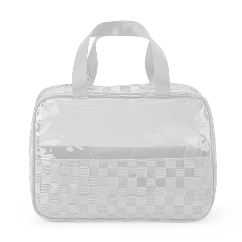 Nécessaire de PVC e couro sintético impermeável em xadrez . Possui visor transparente e duas alças laterais de mão em nylon.
