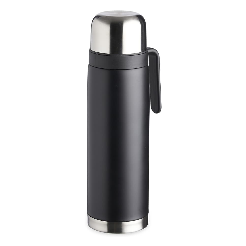 Garrafa térmica 900ml em inox com alça plástica. Possui tampa rosqueável, tampa interna rosqueável com bico plástico vermelho.