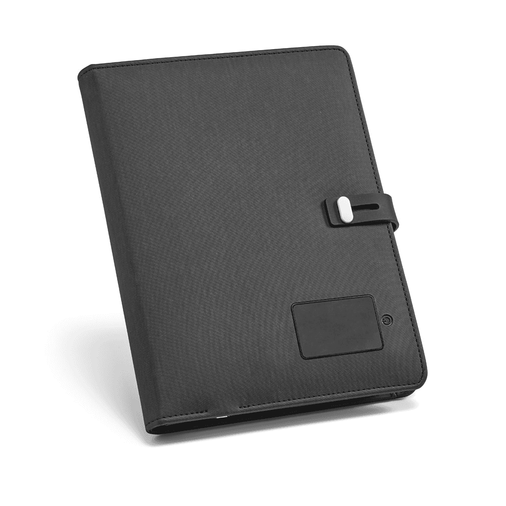 Modelo: 52075 AFONSO. Pasta A5 em c. sintético com bateria portátil embutida (lítio) 4.000 mAh e caderno com 128 páginas pautadas