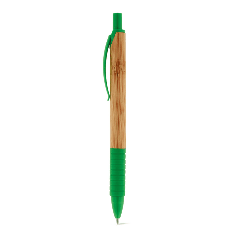 Esferográfica em bambu com antideslizante, clipe e ponteira de plástico. Escrita em preto. A cor e o resultado da impressão nos materiais naturais pode variar entre produtos. ø11 x 142 mm