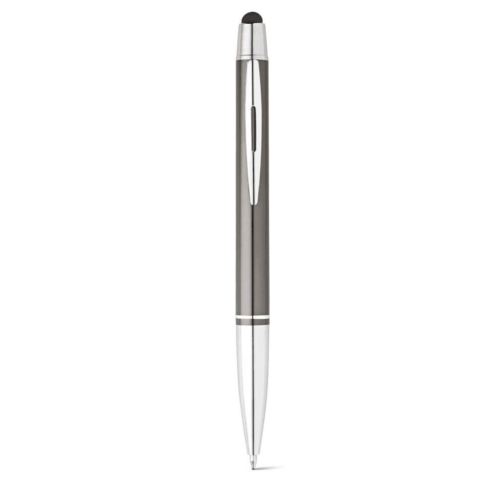 Esferográfica em alumínio com mecanismo twist, ponteira touch e clipe de metal. Escrita em azul até 1,5 km. ø11 x 135 mm