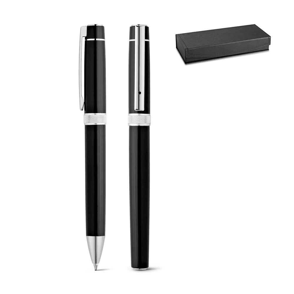 Conjunto de roller e esferográfica com mecanismo twist, ambos em alumínio e com clipe. Escrita em preto até 2,5 km. Fornecido em estojo presente almofadado. ø12 x 132 mm | Estojo: 170 x 70 x 30 mm