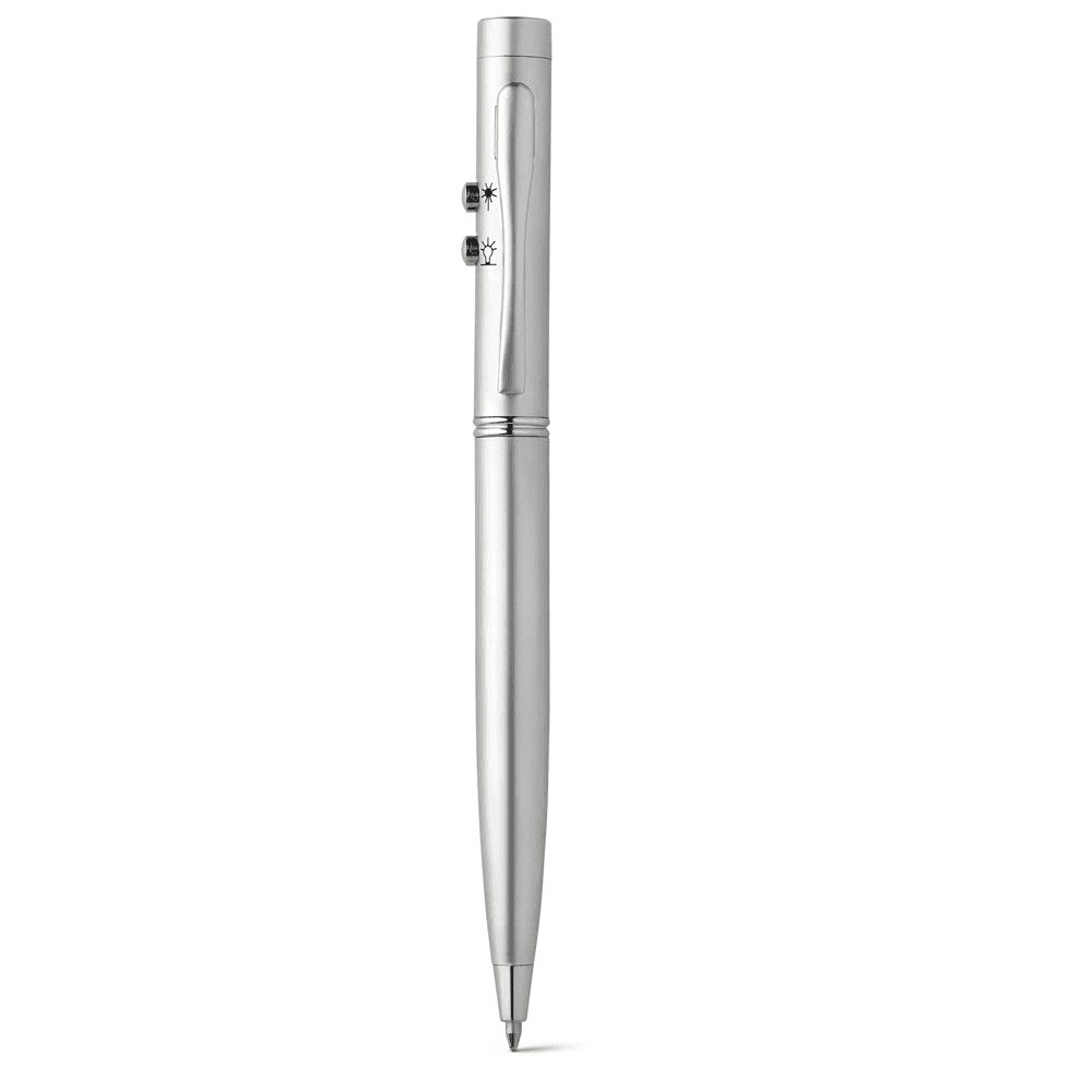 Esferográfica em metal, com ponteira laser e LED. Incluso 3 pilhas LR41. Escrita em azul até 1,5 km. Fornecida em estojo com forro de veludo. ø10 x 131 mm | Estojo: 170 x 50 x 20 mm