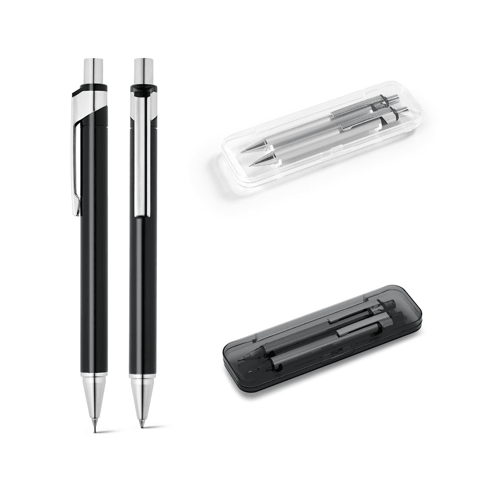 Conjunto de esferográfica e lapiseira em alumínio. Escrita em azul até 1,5 km. Lapiseira com grafite 0.5 mm. Incluso estojo. ø11 x 137 mm | Estojo: 165 x 50 x 24 mm