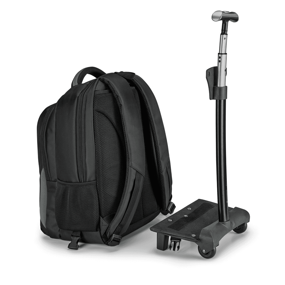Mochila trolley para notebook em Nylon 999 impermeável com 2 rodas com sistema de proteção integrado. Possui um compartimento principal almofadado para notebook até 17’’, um compartimento forrado e diversos bolsos. Bolso frontal com zíper e bolsos laterais em tela mesh. Trolley com pega extensível em alumínio com mola (altura da pega estendida até 550 mm), sendo a estrutura removível. Placa metálica removível com imã para fácil gravação. Capacidade até 30 L e peso de 1,70 kg. 350 x 460 x 225 mm | Placa: 50 x 20 mm