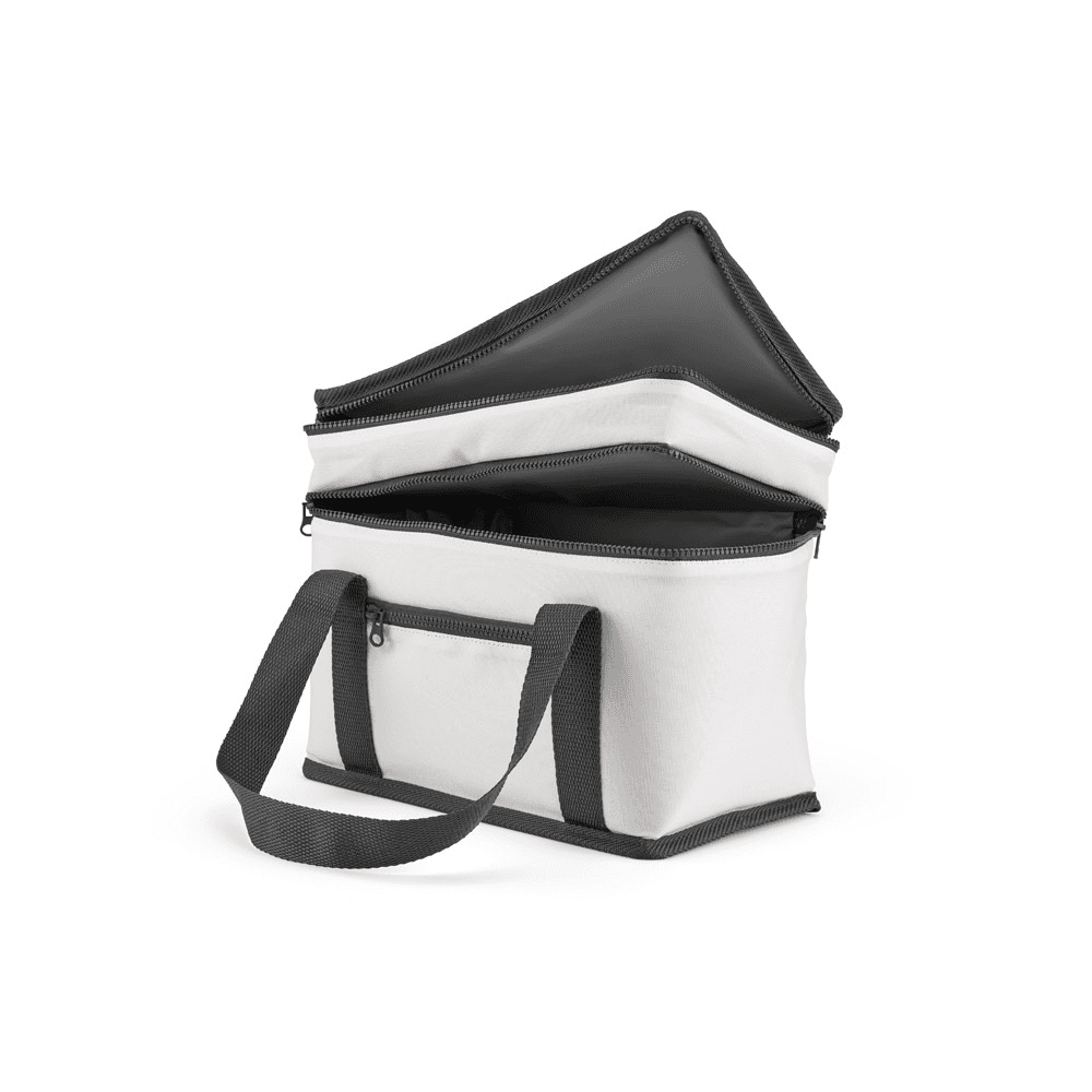 Sacola térmica em poliéster reciclado 600D. Contém 2 compartimentos principais com isolamento em PEVA para facilitar a higienização e um bolso frontal com zíper. Capacidade até 9.5 L. Certificação EU Food Grade. 280 x 230 x 160 mm
