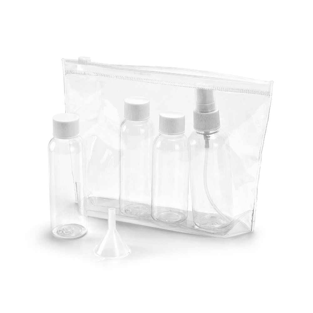 Bolsa de cosméticos hermética em PVC. Incluso 3 frascos (2 x 65 mL e 60 mL), 1 vaporizador (80 mL) e 1 funil. Apropriada para transporte em cabine de avião. 190 x 155 x 40 mm