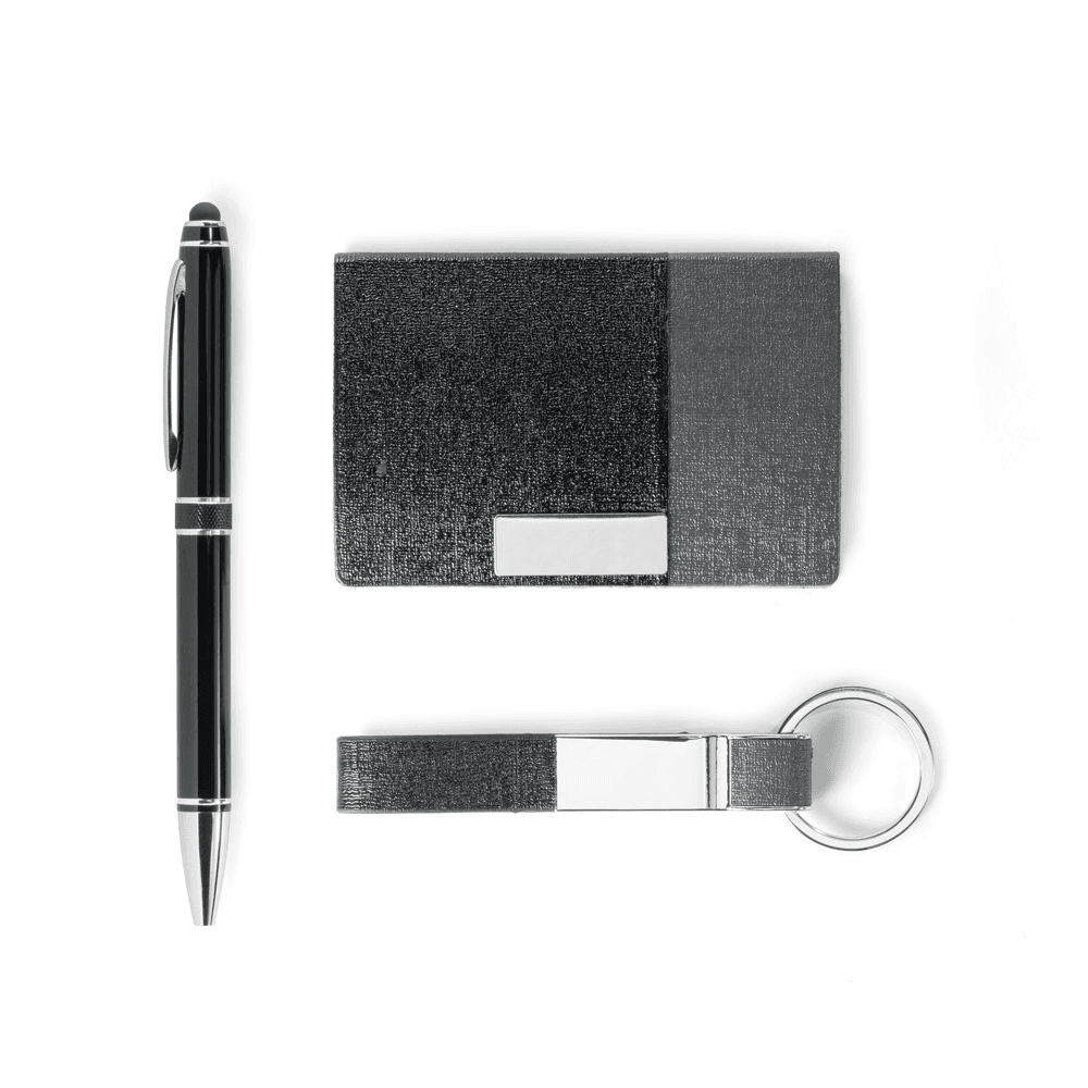 Conjunto composto por um porta cartões, um chaveiro e uma esferográfica em c. sintético, metal e alumínio. A esferográfica tem ponteira touch e o porta cartões uma capacidade até 7 cartões. Fornecido em caixa presente almofadada. Porta cartões: 97 x 65 x 11 mm | Chaveiro: 15 x 92 x 8 mm | Esferográfica: ø11 x 135 mm | Caixa: 174 x 163 x 34 mm