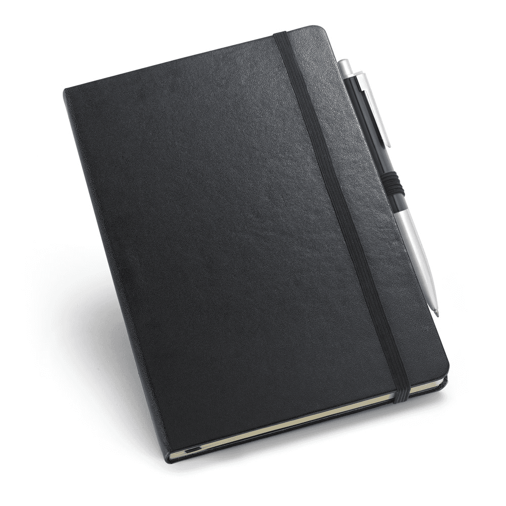 Kit de caderno A5 e esferográfica em cartão e alumínio. Caderno capa dura com 192 páginas lisas de cor marfim. Esferográfica de escrita a preto. Fornecidos em caixa almofadada. Caderno: 137 x 210 mm | Esferográfica: ø11 x 136 mm | Caixa: 190 x 240 x 30 mm