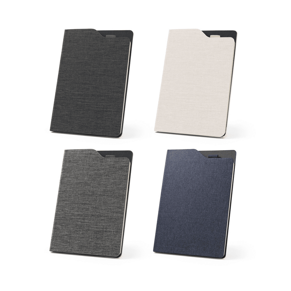 Caderno A5 de capa dura em tecido PET 100% reciclado (rPET). Contém 160 páginas pautadas em papel cor marfim 100% reciclado, fita separadora e suporte de esferográficas no topo do caderno (não inclusa). 148 x 212 mm