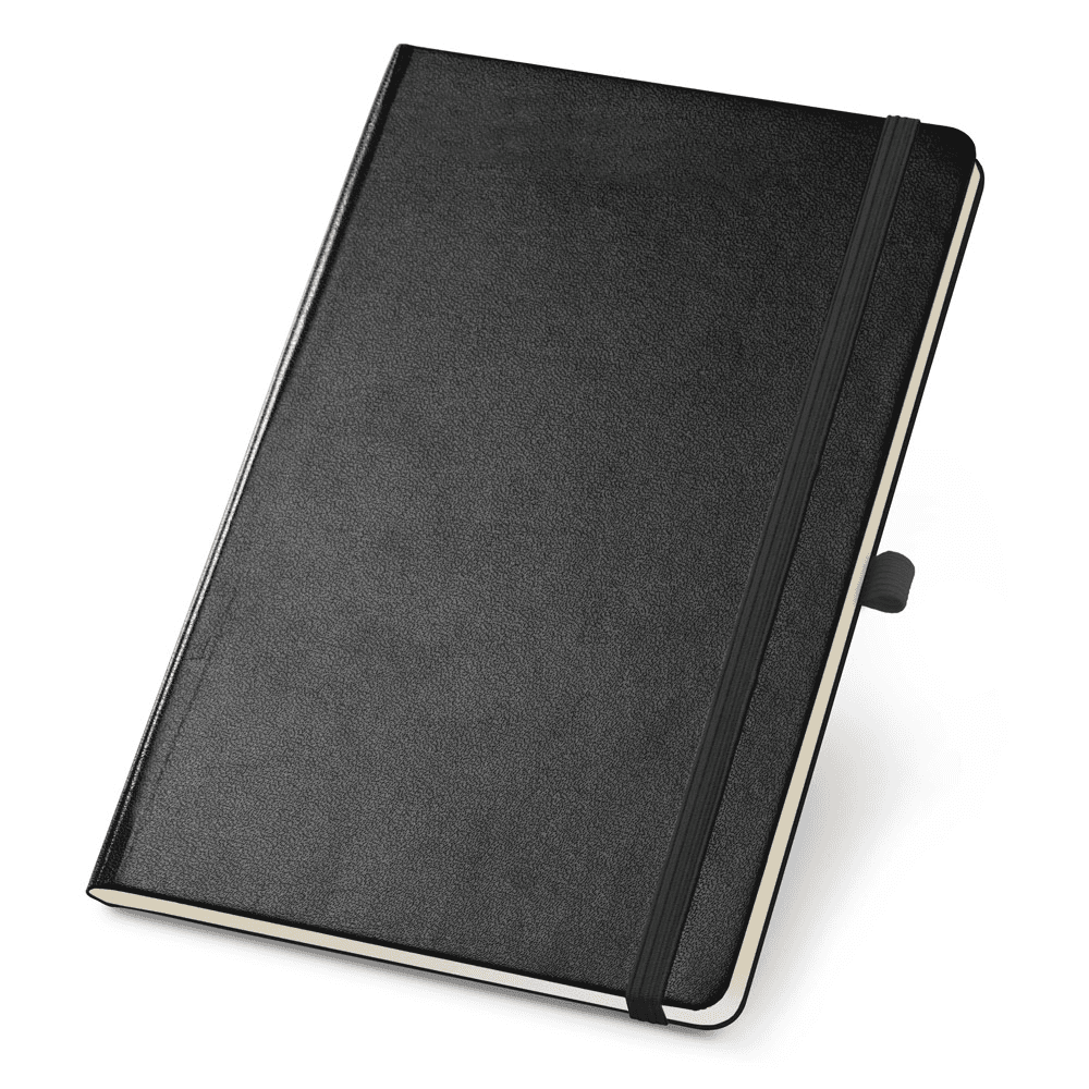 Caderno A6 de capa dura com 160 páginas lisas em cor marfim, com suporte para esferográfica (não inclusa) e bolso interior. 97 x 145 mm